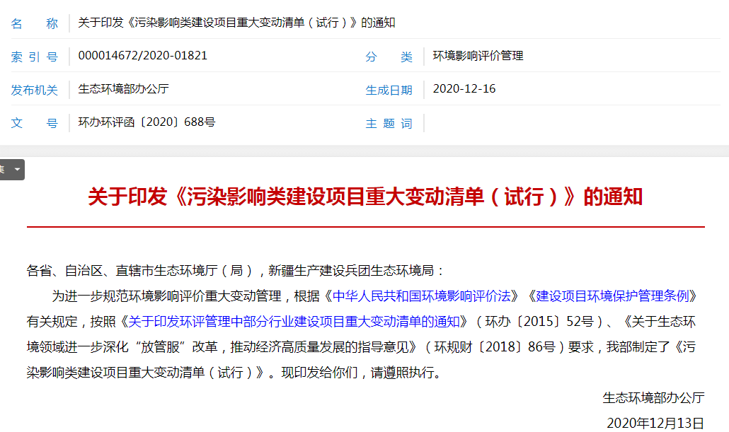 生態(tài)環(huán)境部發(fā)布《污染影響類(lèi)建設(shè)項(xiàng)目重大變動(dòng)清單(試行)》