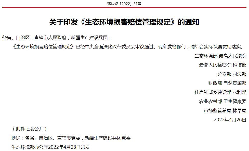 關于印發(fā)《生態(tài)環(huán)境損害賠償管理規(guī)定》的通知