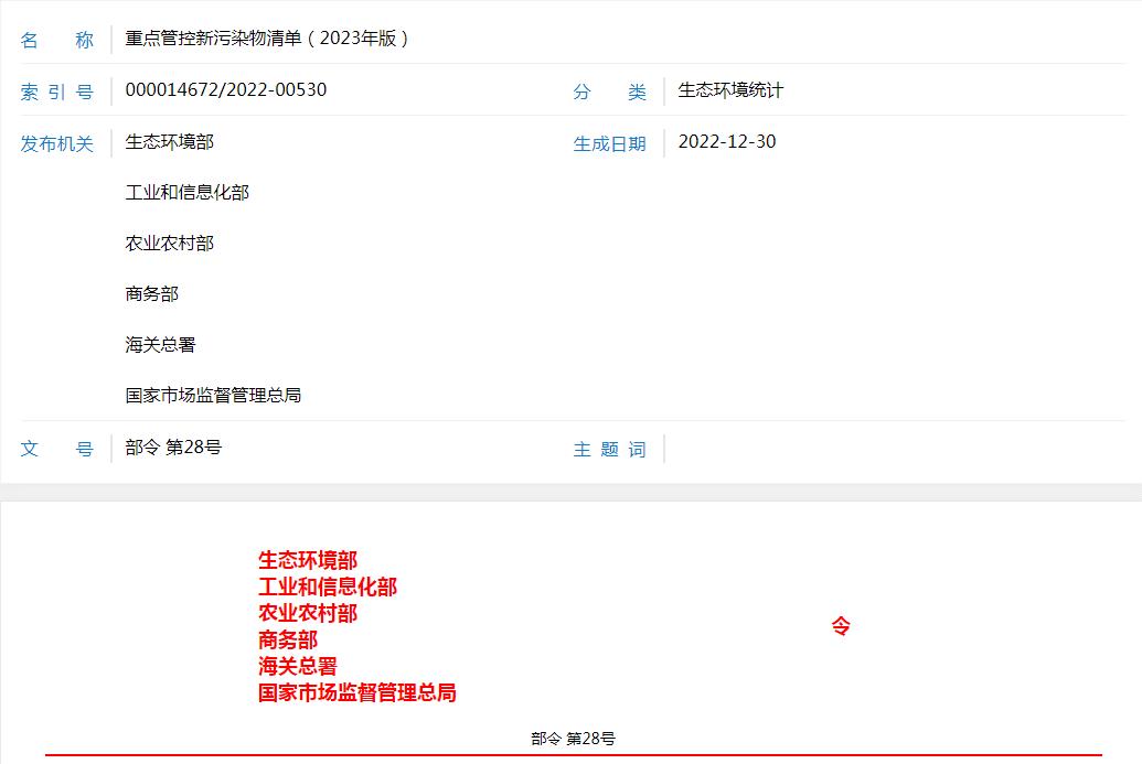 《重點管控新污染物清單(2023年版)》已于2022年11月29日由生態(tài)環(huán)境部2022年第五次部務會議審議通過,并經工業(yè)和信息化部、農業(yè)農村部、商務部、海關總署、國家市場監(jiān)督管理總局同意,現予公布,自2023年3月1日起施行。